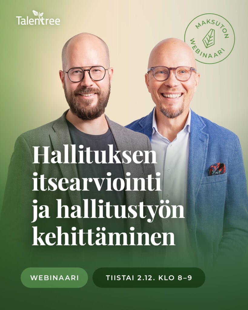 Huippuasiantuntijoina webinaarissa toimivat hallitustyön ammattilaiset Mika Sutinen ja Antti Haapakorva.